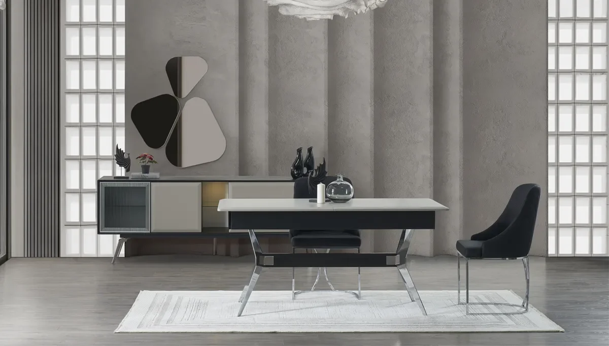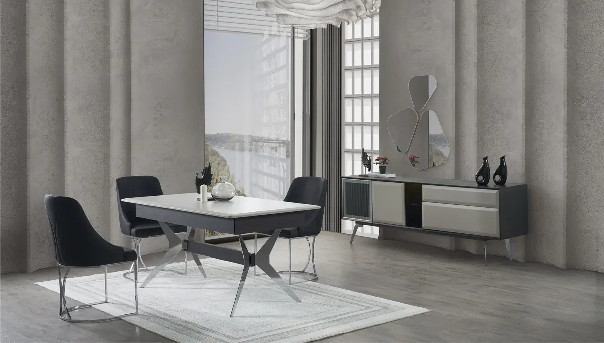 Calmira Gri Yemek Odası Takımı, doğallığı ve estetiği birleştirerek boho yaşam tarzını yemek alanlarına taşıyor. Ahşap yüzeylerin sıcaklığı, etnik desen detayları ve yumuşak renk tonlarıyla harmanlanan tasarımı, sade ama etkileyici bir ambiyans yaratıyor. Geniş yemek masası ve konforlu sandalyeleriyle hem günlük sofralara hem de özel davetlere şıklık katıyor. Doğaya yakın malzemelerden üretilen Aluna, fonksiyonel yapısıyla kullanım kolaylığı sunarken, dekoratif görünümüyle de öne çıkıyor. Bohem tarzı sevenler için zarif, özgün ve davetkar bir yemek odası takımıdır.