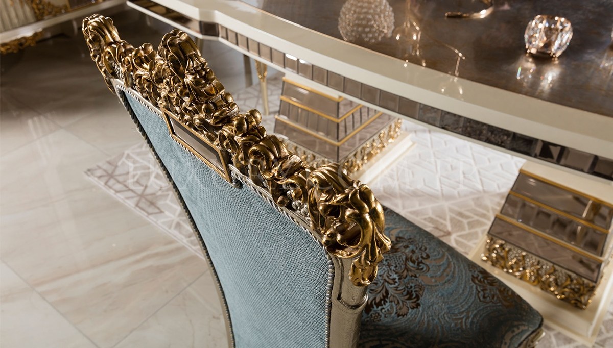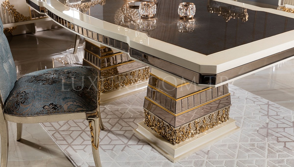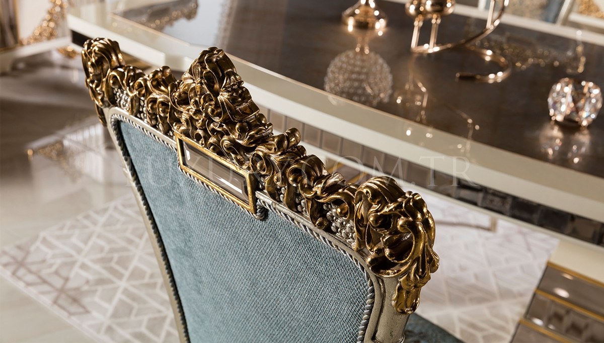 Hanedan Lüks Yemek Odası, geleneksel saray mimarisinden ilham alarak tasarlandı. El işçiliğiyle işlenmiş zarif oymalar, altın ve gümüş detaylarla süslenmiş masa ve sandalyeler, bu takımı görkemli bir başyapıt haline getiriyor. Geniş ve şık yemek masası, özel davetler ve aile yemekleri için kusursuz bir buluşma noktası sunuyor. Saray ihtişamını yaşam alanınıza taşımak isteyenler için Hanedan, zamansız bir lüks vadediyor.