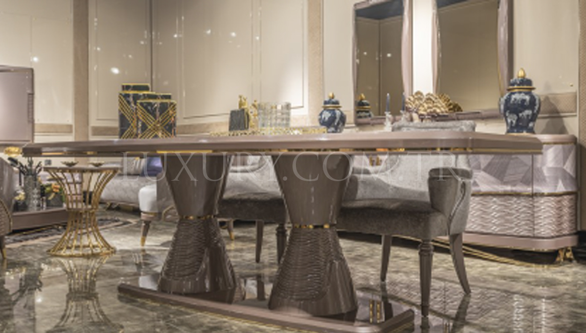 Lotaro Luxury Yemek Odası, şıklığı ve işlevselliği bir arada sunan modern bir tasarımdır. Geniş yemek masası ve konforlu sandalyeleri, hem günlük kullanım hem de özel davetlerde mükemmel bir deneyim sunar. Zarif detayları ve kaliteli malzemeleriyle dayanıklı olan bu yemek odası, sofistike bir atmosfer yaratır. İnce işçilik ve zarif oymalar, her bir parçasında modernizmi ve zarafeti bir araya getirir. Lotaro, evinizdeki yemek anlarını özel kılmak için tasarlandı.