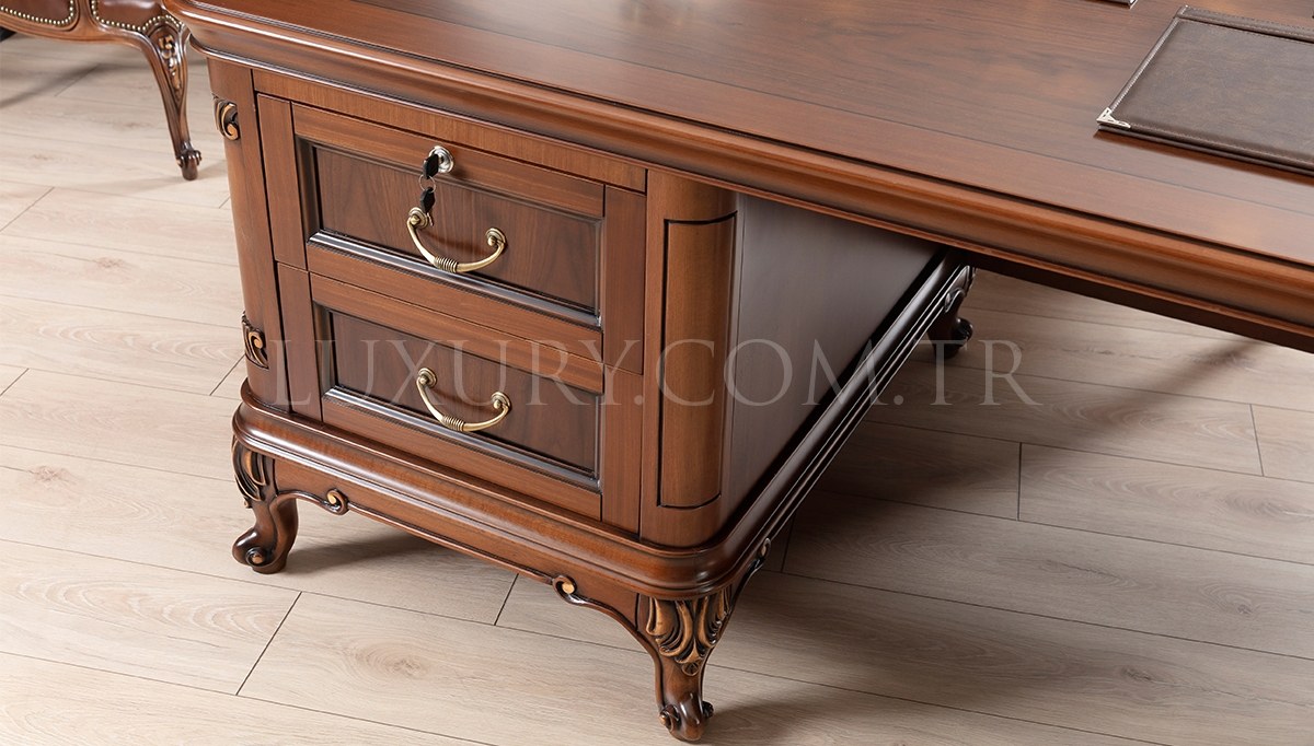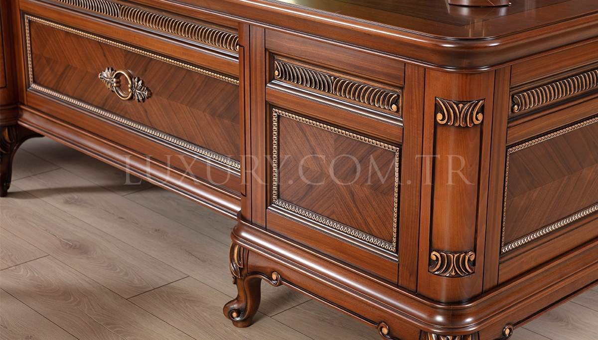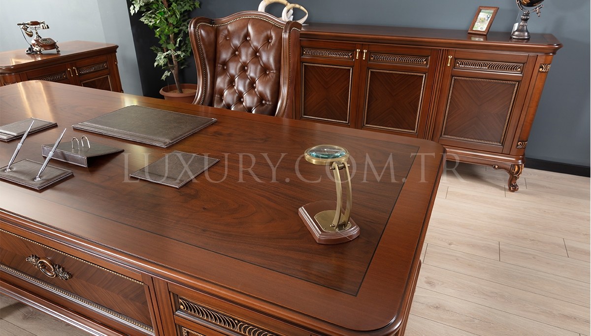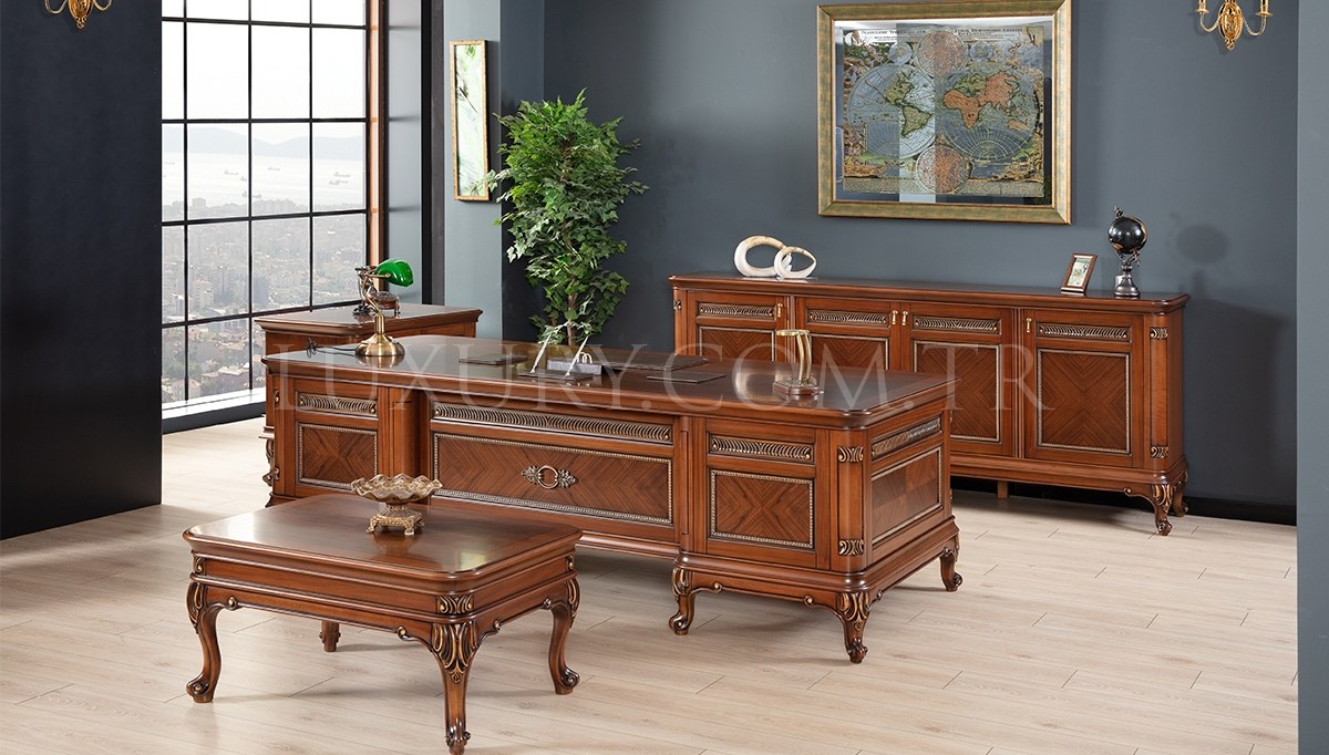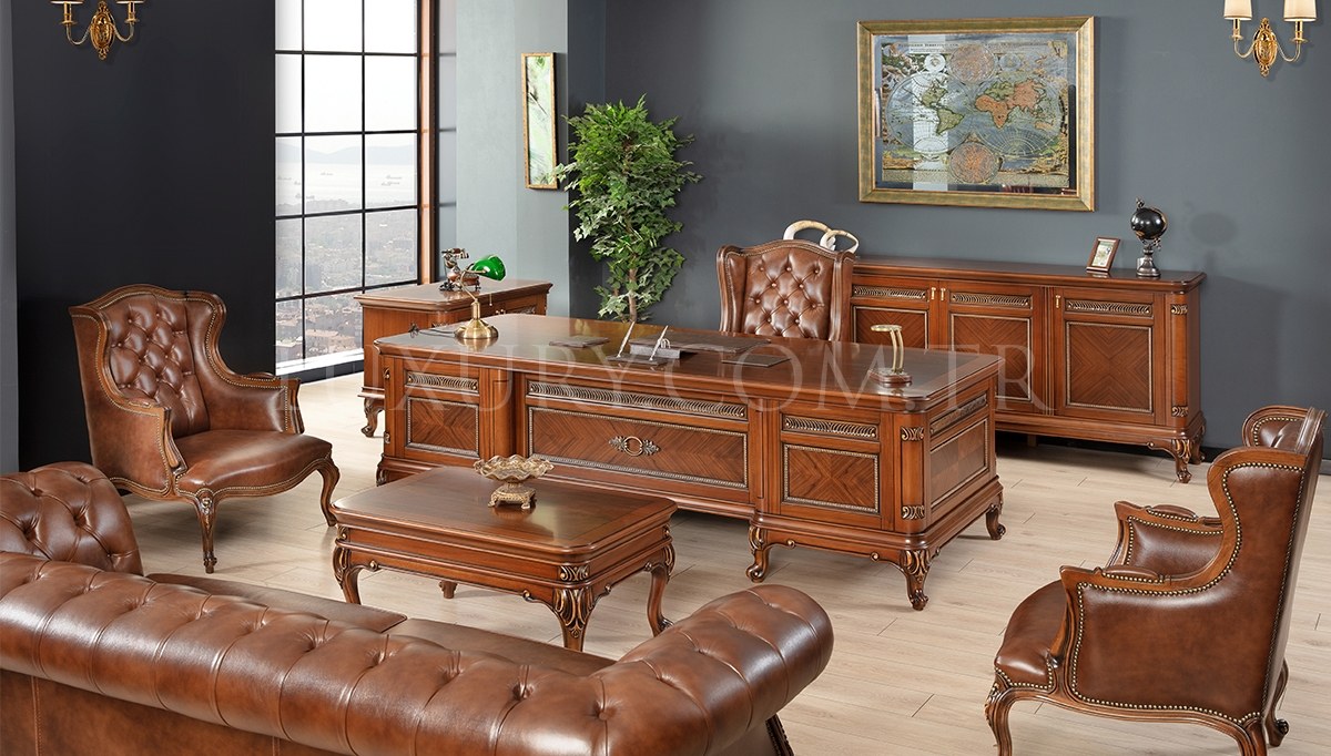 | Takım İçeriği: | Masa, konsol, etajer, orta sehpa takım olarak satılmaktadır. Parça satışı yoktur. 1 adet makam koltuğu ve 2 adet berjerden (suni deri) fiyata dahil olup isteğe bağlı tercih edilebilir. Üçlü chester koltuk opsiyonel olarak satışa sunulmuştur. |