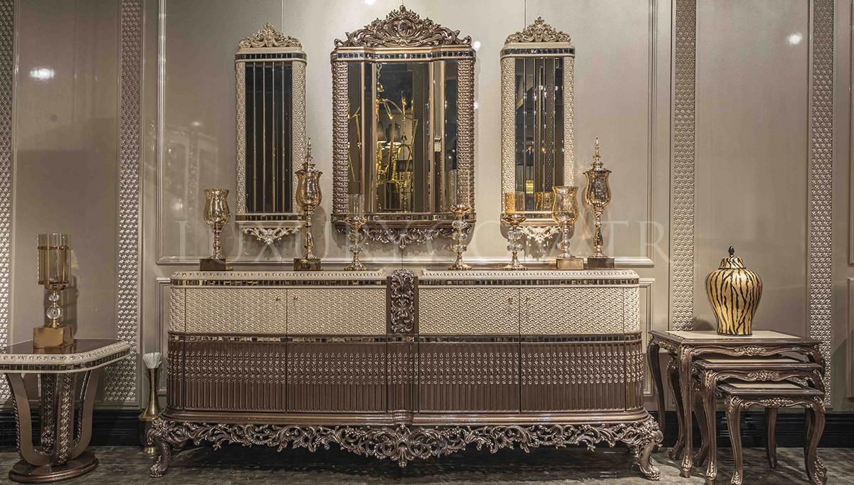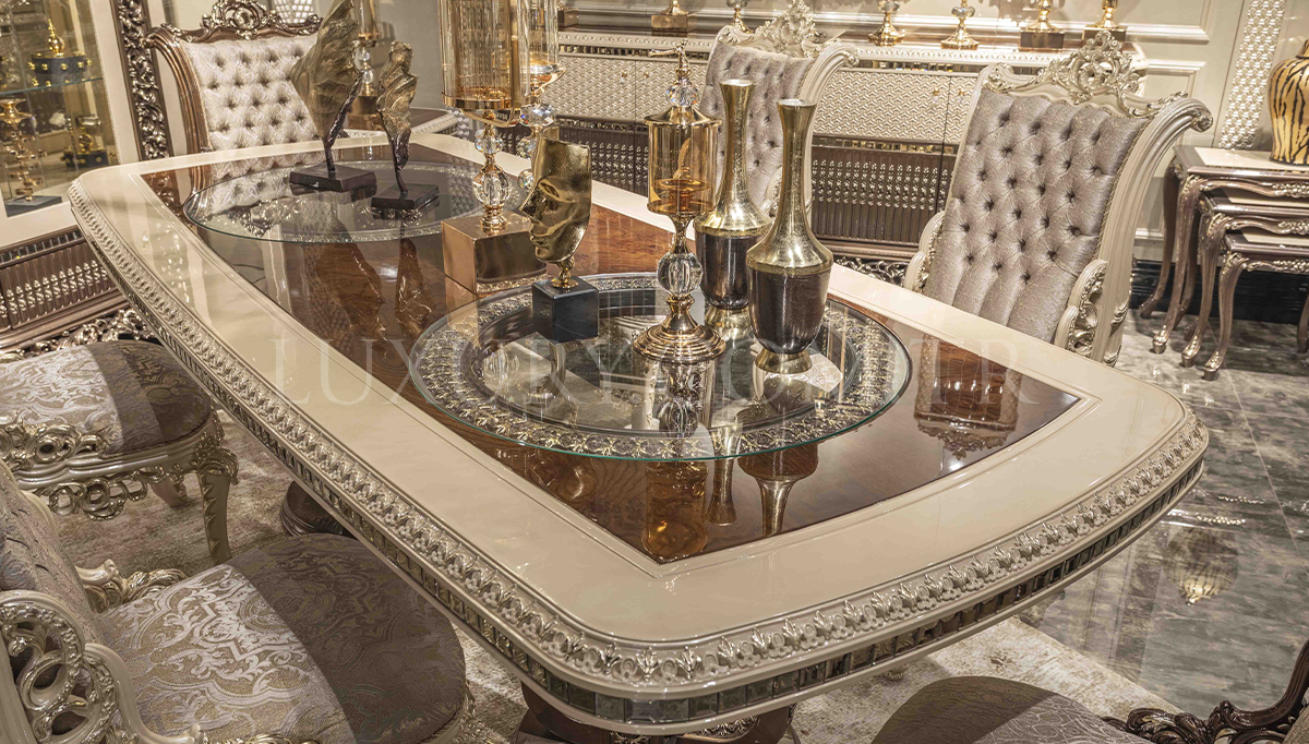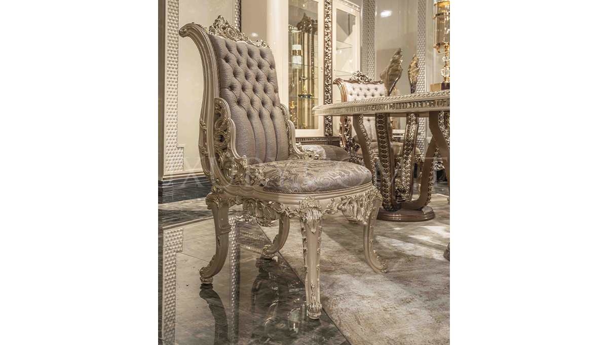 Lüks Vita Klasik Yemek Odası, detaylı işçilik ve üstün estetik anlayışıyla yemek alanınıza şıklık katıyor. Zarif oyma detayları ve göz alıcı tasarımı, klasik mobilya tutkunları için ideal bir seçim sunar. Geniş masa ve konforlu sandalye tasarımı, hem aile yemeklerinde hem de özel davetlerde benzersiz bir atmosfer yaratır. Yüksek kaliteli malzemeleri, dayanıklılığı ve lüks dokusuyla yıllar boyunca prestijli bir kullanım sağlar. Vita, yemek odanızda unutulmaz anılara eşlik etmek için tasarlandı.