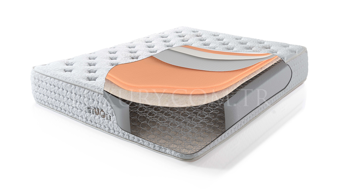 | Ürün Malzemesi | Tivoli yatak, tasarımında kullanılan yüksek yoğunluktaki üst katmanı, yüksek mukavemetli yaylardan oluşan taşıyıcı sistemi ile uyku kalitesini arttırırken, yatağın yıllarca deforme olmadan kullanılmasını sağlar. Özel olarak kapitone edilmiş pamuklu örme kumaşı, sürekli hava sirkülasyonu sağlayarak bakteri oluşumunu önler. Bonel Yay, Kuştüyü Sünger, Çift Taraflı Kullanım, Örme Kumaş. |