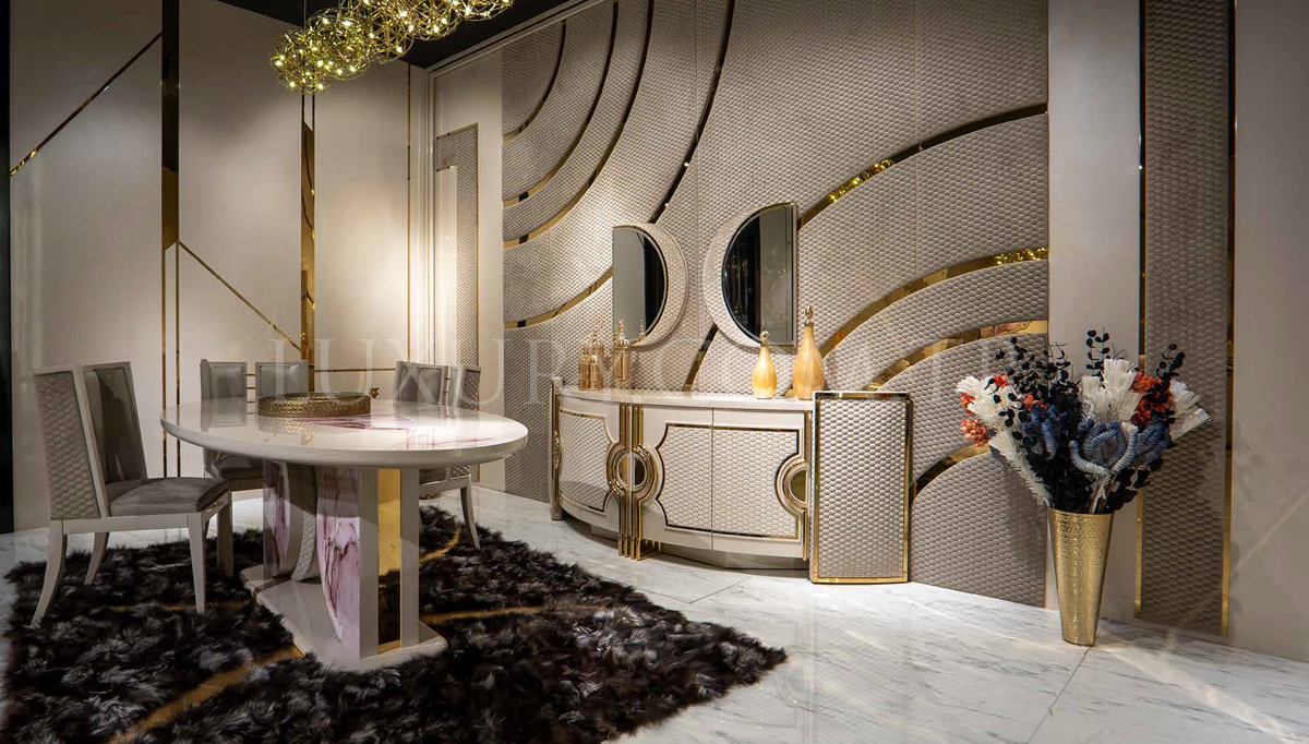 Meldola Luxury Yemek Odası, ince el işçiliği ve göz alıcı detaylarıyla lüksü yaşam alanlarınıza taşıyor. Şık oyma desenleri, özel tasarım yemek masası ve konforlu sandalyeleri, yemek davetlerinizi eşsiz bir deneyime dönüştürüyor. Zamansız tasarımı ve kaliteli malzemeleriyle Meldola, hem estetiği hem de fonksiyonelliği bir arada sunuyor.