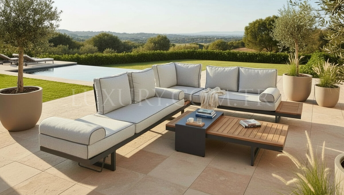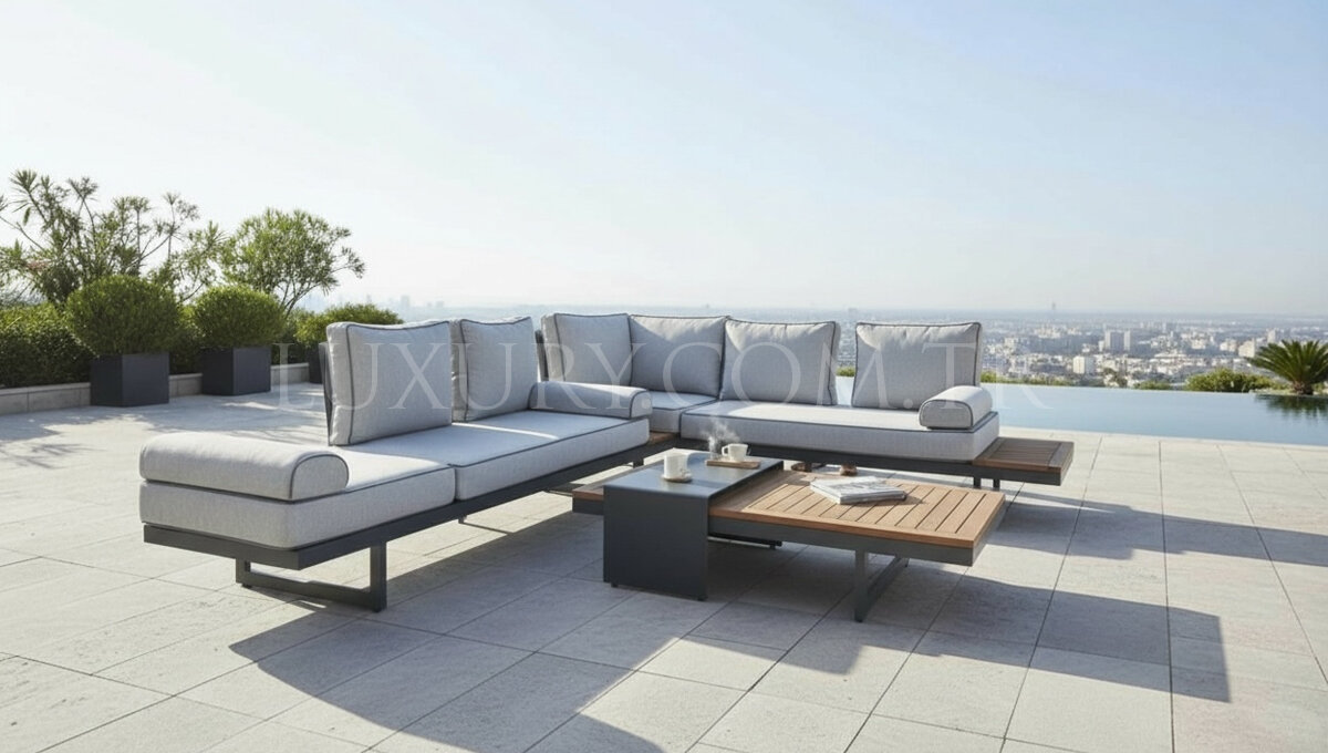 Luxury Line Mobilya imzası taşıyan Sera Alüminyum Bahçe Köşe Takımı, dış mekân yaşam alanlarınıza modern şıklık ve üst düzey konfor kazandırmak için tasarlanmıştır. Estetik çizgileri ve fonksiyonel yapısıyla dikkat çeken bu özel model, bahçe, teras ve balkon gibi alanlarda hem görsel bütünlük hem de rahat kullanım sunar.