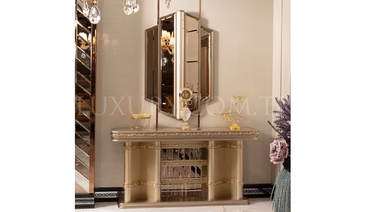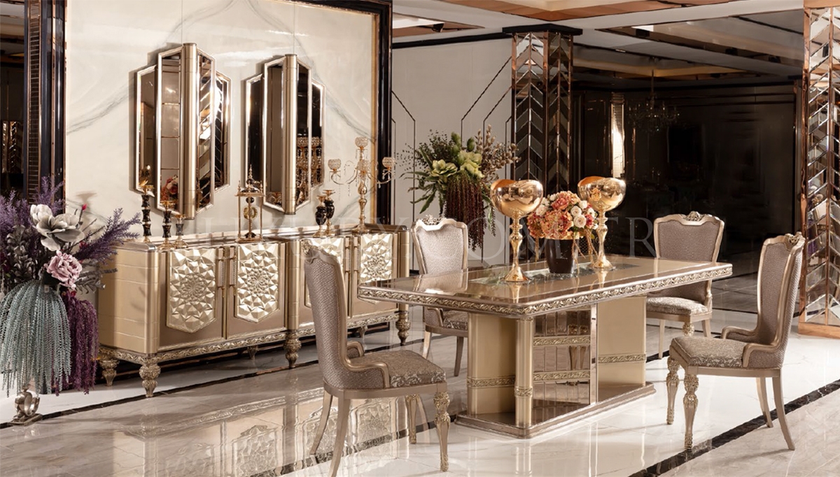 | Takım İçeriği | Konsol, Ayna (2 Adet), Yemek Masası, 6 Adet Sandalye'den oluşmaktadır. Vitrin, TV Ünitesi Ve Dresuar Fiyata dahil değildir.Opsiyonel olarak satışa sunulmaktadır. |