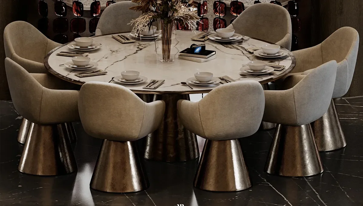Özellikle İtalyan tasarımı çizgileriyle öne çıkan yemek masalarımız, sofistike detayları ve zamansız şıklığıyla modern dekorasyon anlayışına mükemmel uyum sağlıyor. Yuvarlak masa seçeneklerimiz, samimi ve keyifli sohbetlerin odak noktası olurken, mermer desenli yüzeyler ise mekâna lüks bir dokunuş katıyor.