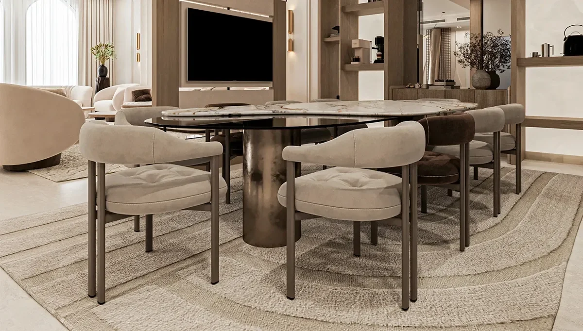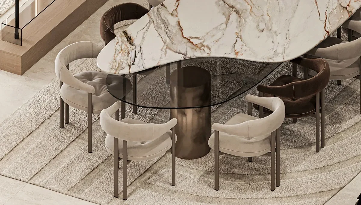 Özellikle İtalyan tasarımı çizgileriyle öne çıkan yemek masalarımız, sofistike detayları ve zamansız şıklığıyla modern dekorasyon anlayışına mükemmel uyum sağlıyor. Yuvarlak masa seçeneklerimiz, samimi ve keyifli sohbetlerin odak noktası olurken, mermer desenli yüzeyler ise mekâna lüks bir dokunuş katıyor.